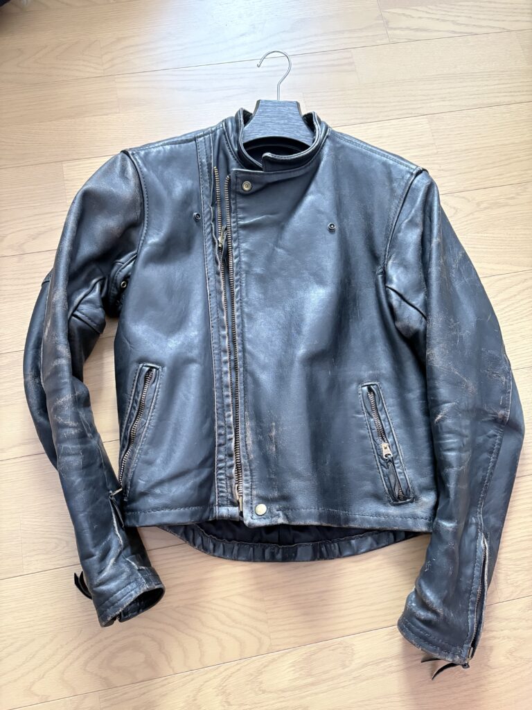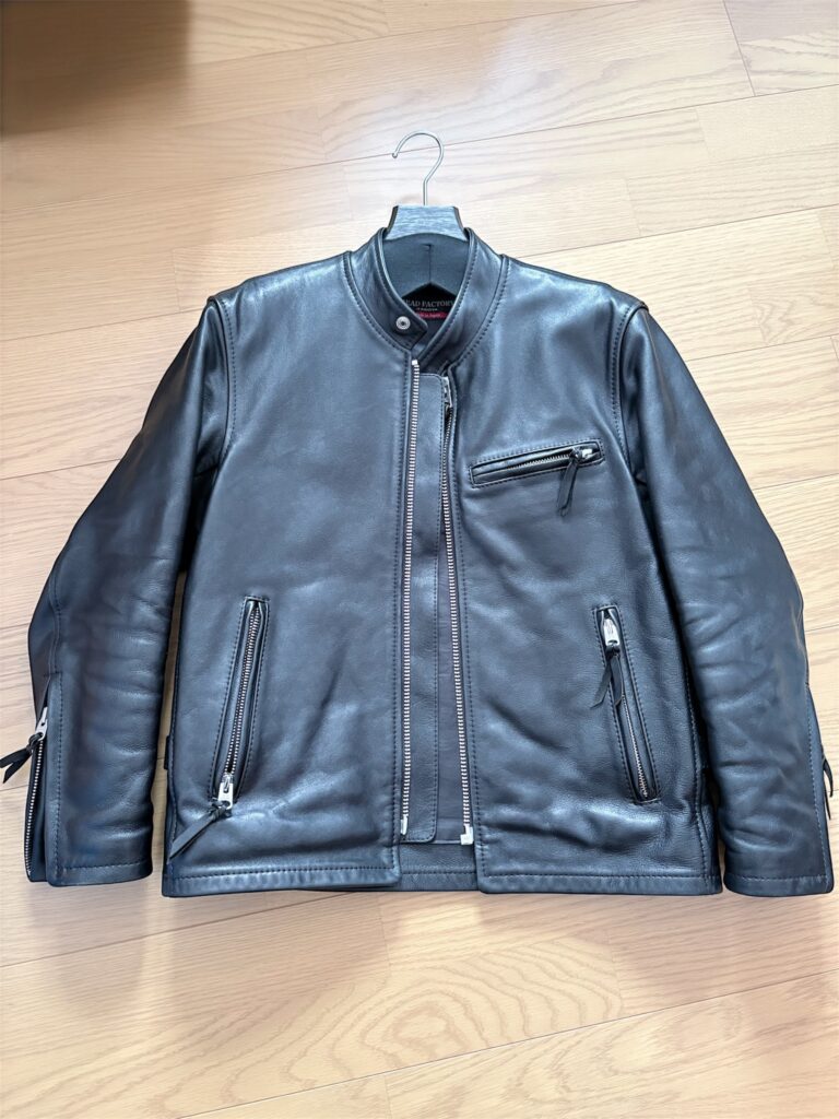 今回は少しサイズが大きく感じるとのことで、**「自分にとって一番ちょうどいいサイズ」**の別の革ジャンをサンプルとしてお借りしました。
